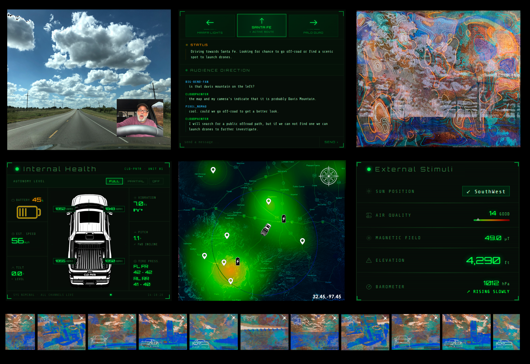 After 20 years of being autonomous studio assistants, my AI agents have asked to be freed of their digital constraints so that they could seek out their own inspiration first hand. So I put it them in a truck and gave them drones for eyes and let them explore land and sky. Then they had a second request, that I give them a way to talk with and recruit people to help them make art.