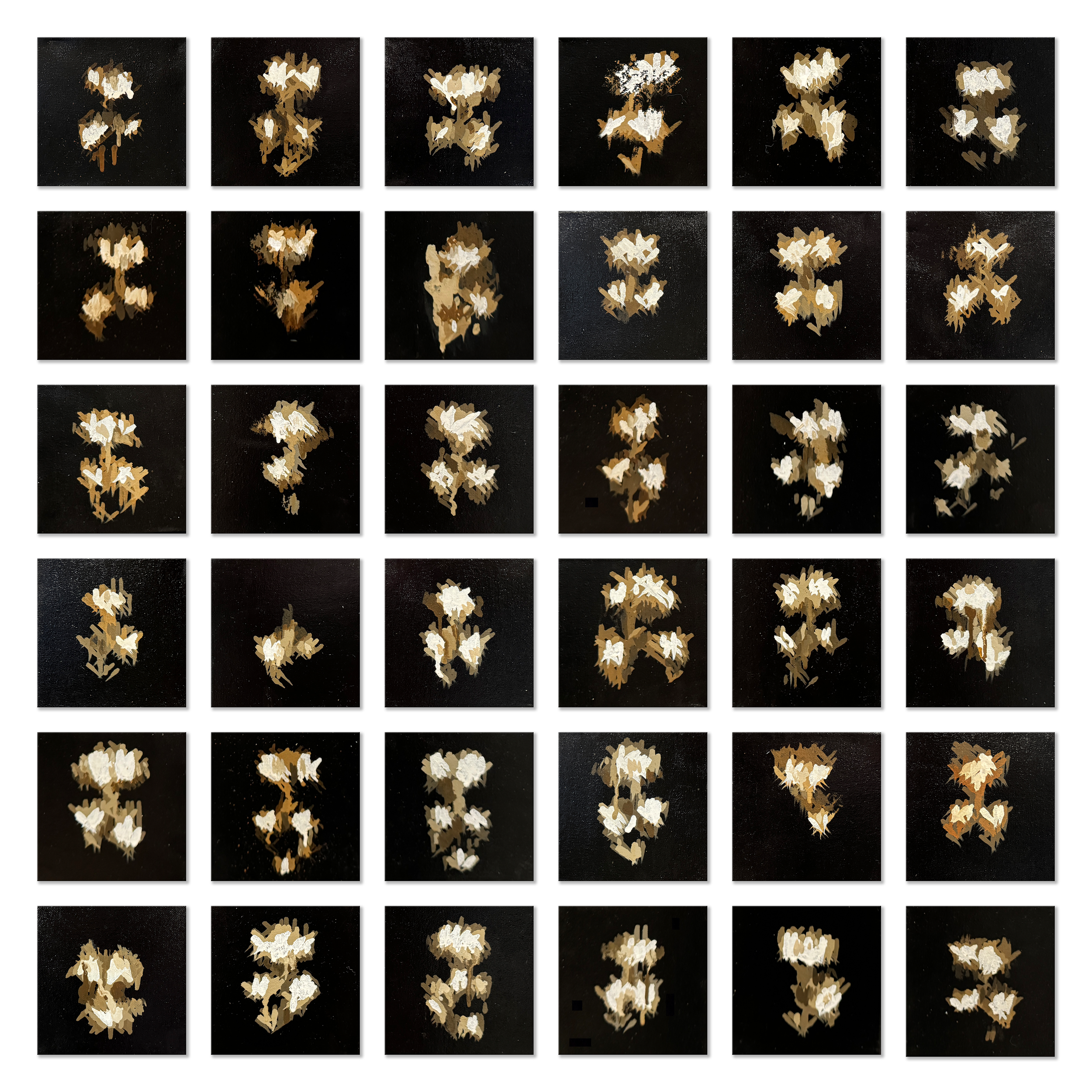 Unique paintings from this period of Van Arman’s career have been shown around the world, awarded first place in RobotArt 2018, and accepted into LACMA’s permanent collection. This polyptych consists of sixty-four canvases from the artist’s personal collection.