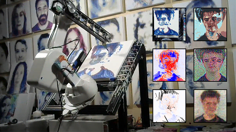 To be precise, my robots currently have 24 of these creative agents. Some are simple like procedural algorithms that measure contrast. Others are a little more complex like the ones that plan brush stroke paths. While the most complex are arrays of neural networks. But at the heart of how it all works are feedback loops. As my robots paint with a brush on canvas, they are constantly taking photos of their progress. With each photo they analyze the direction that the painting is heading in, make adjustments, paint a little more, and take another photo in a creative feedback loop.